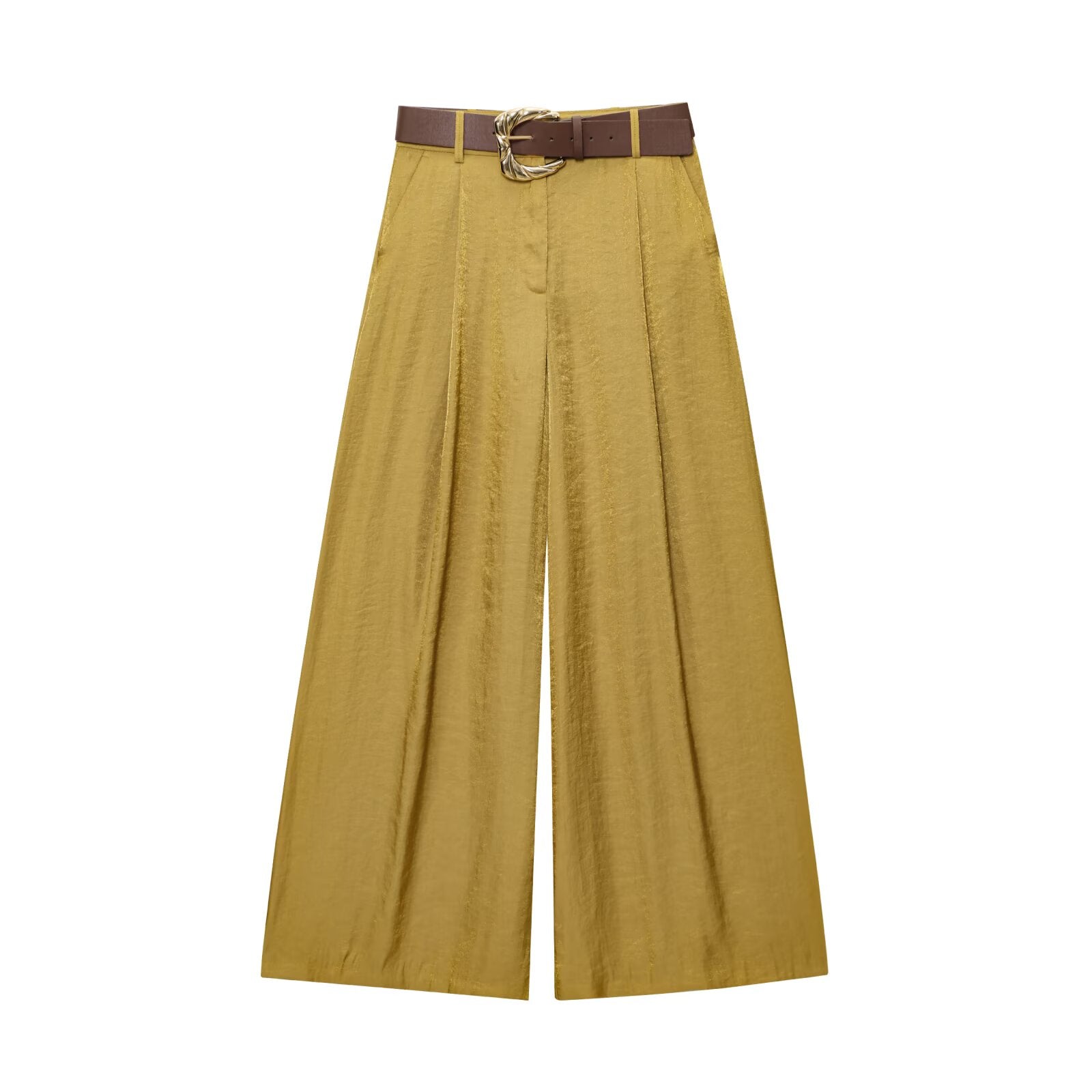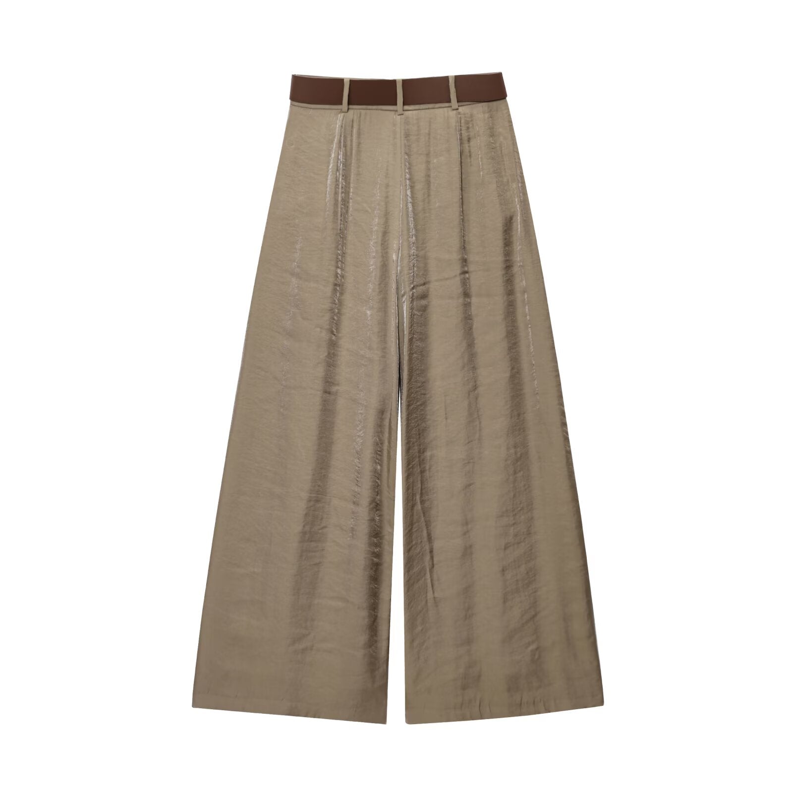 Women's chic Fashion With Belt loose satin texture wide leg pants