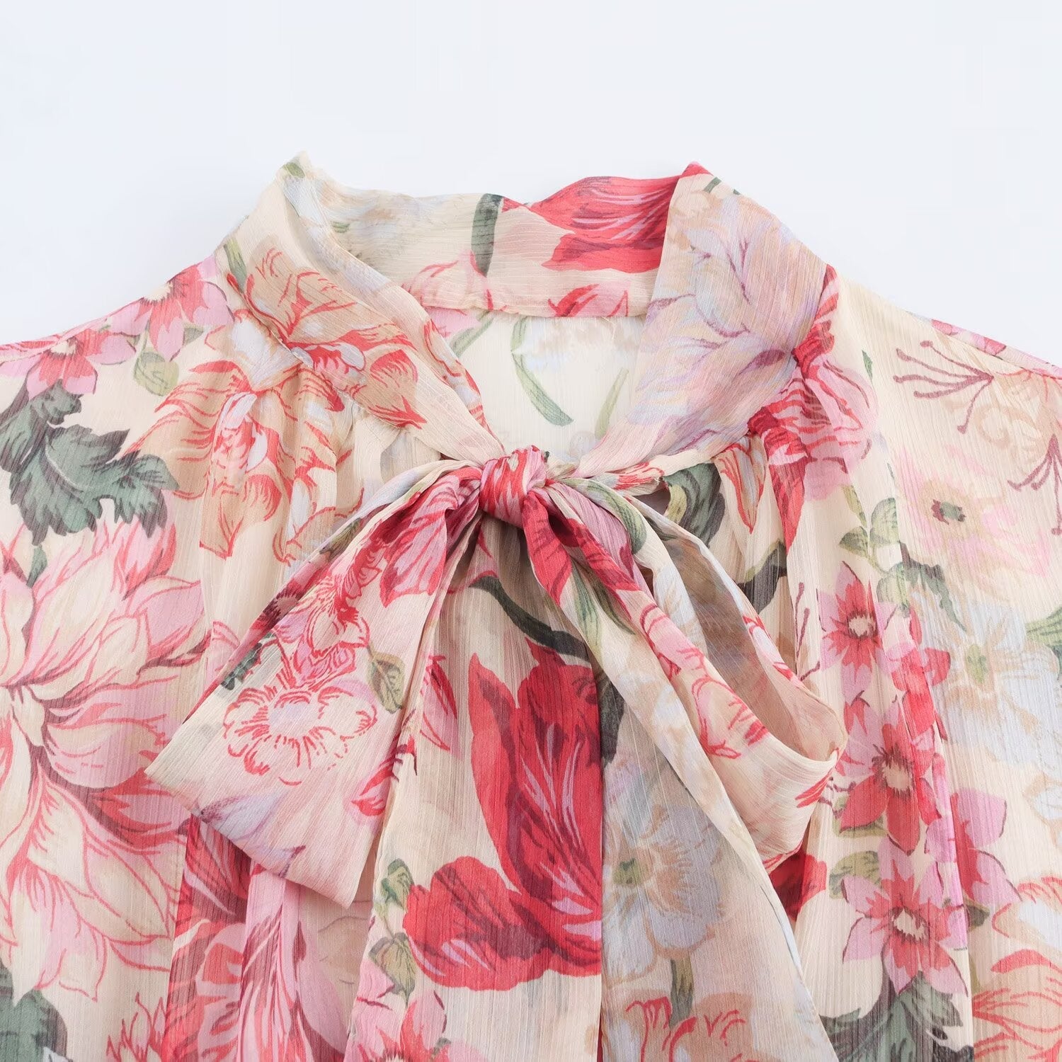 Women's new chic Fashion with Belt bow tie decoration loose flower print MIDI dress retro long sleeved women's dress Mujer