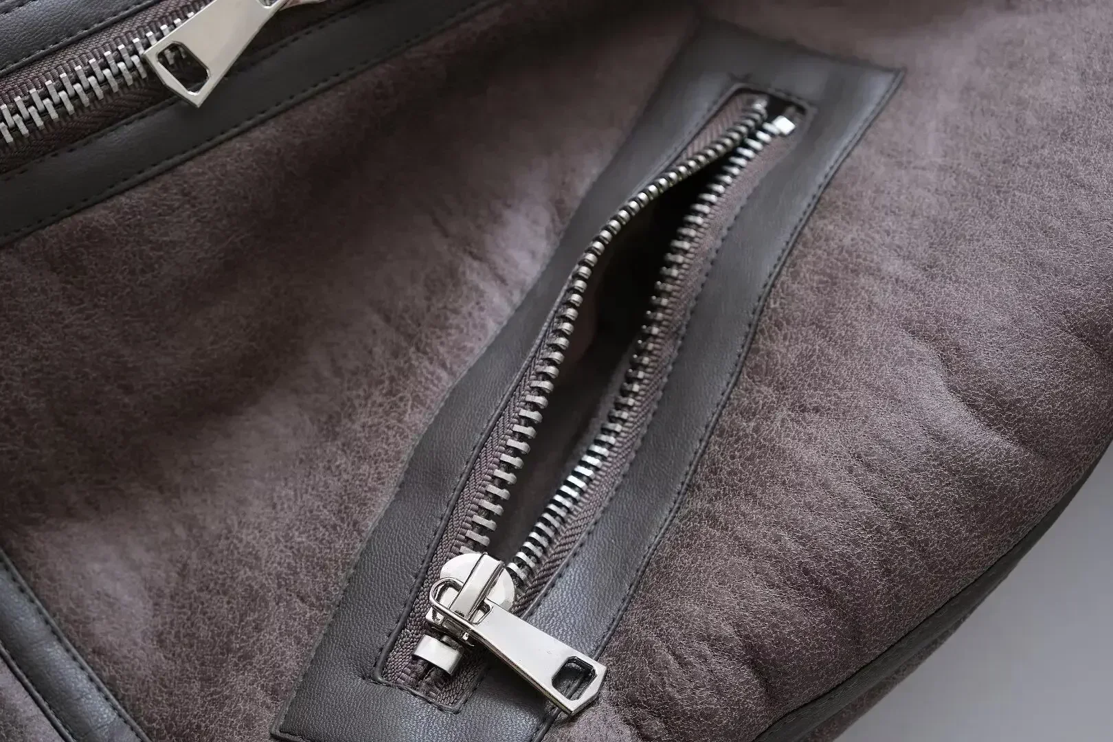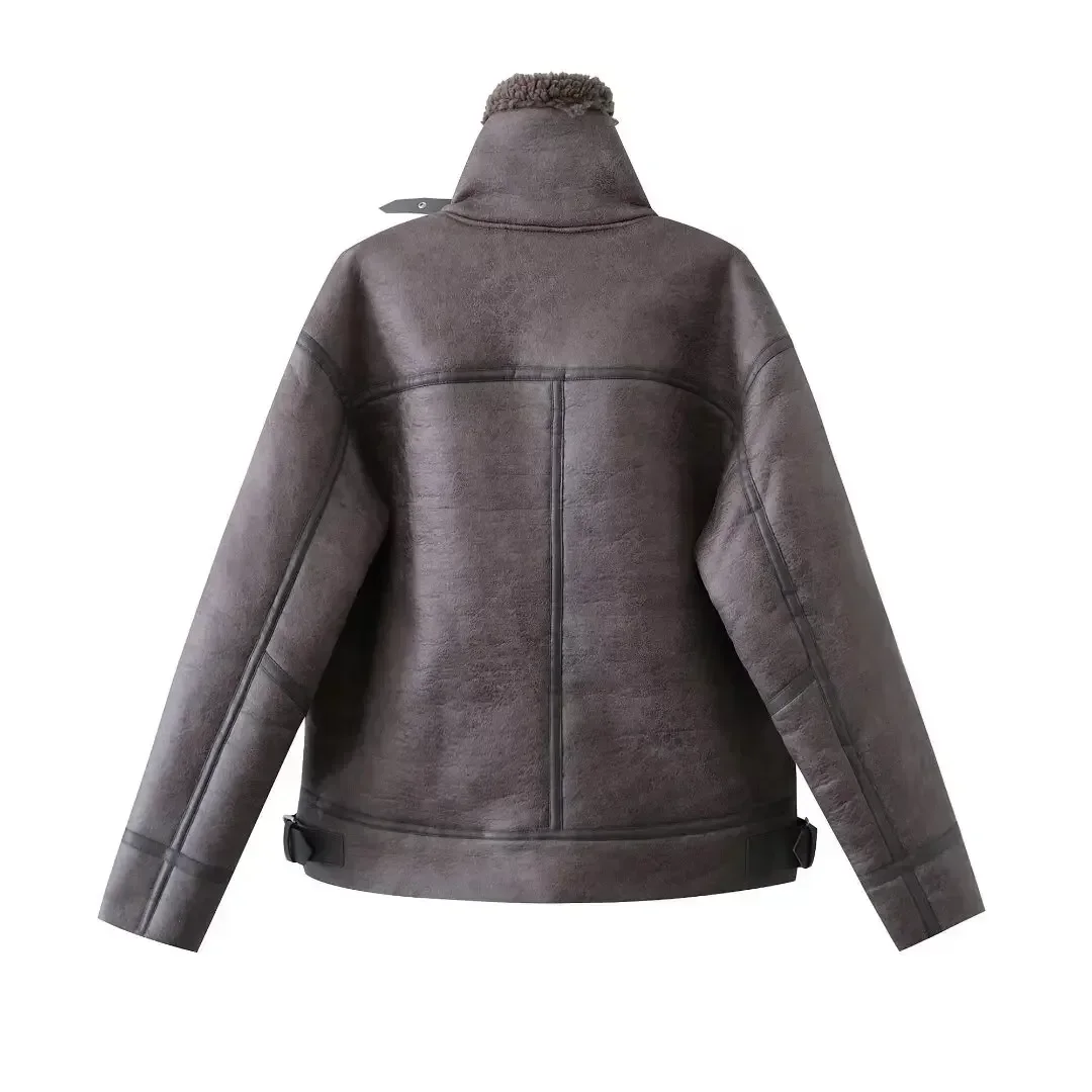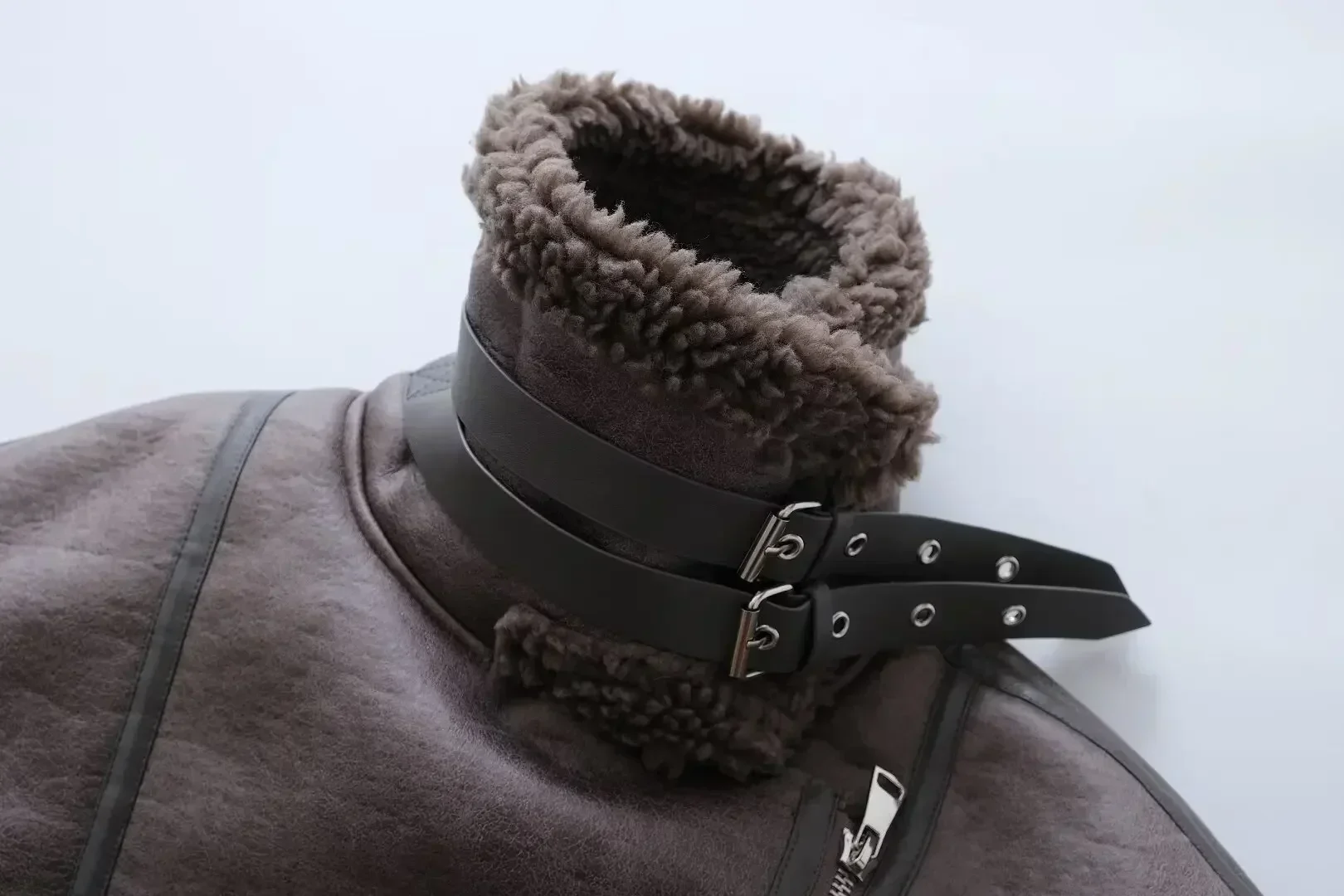Women's new fashion belt decoration casual heavy industry Fur Faux Leather jacket retro long sleeved zipper Female Coat chic top