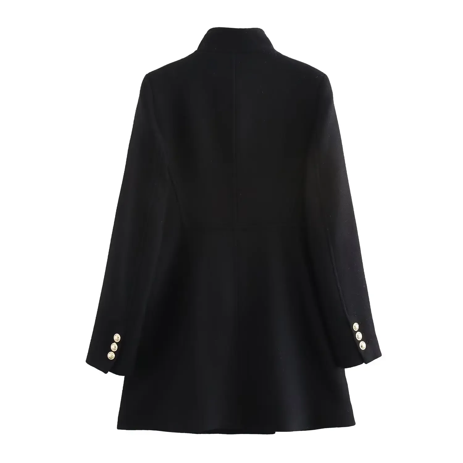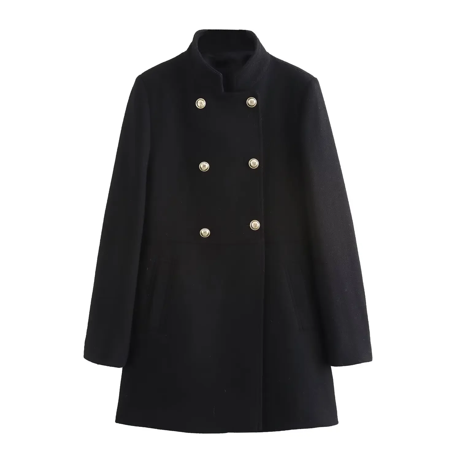 Women's new fashion gold double breasted decoration slim stand Neck woolen coat retro long sleeved pocket women's coat Chic top
