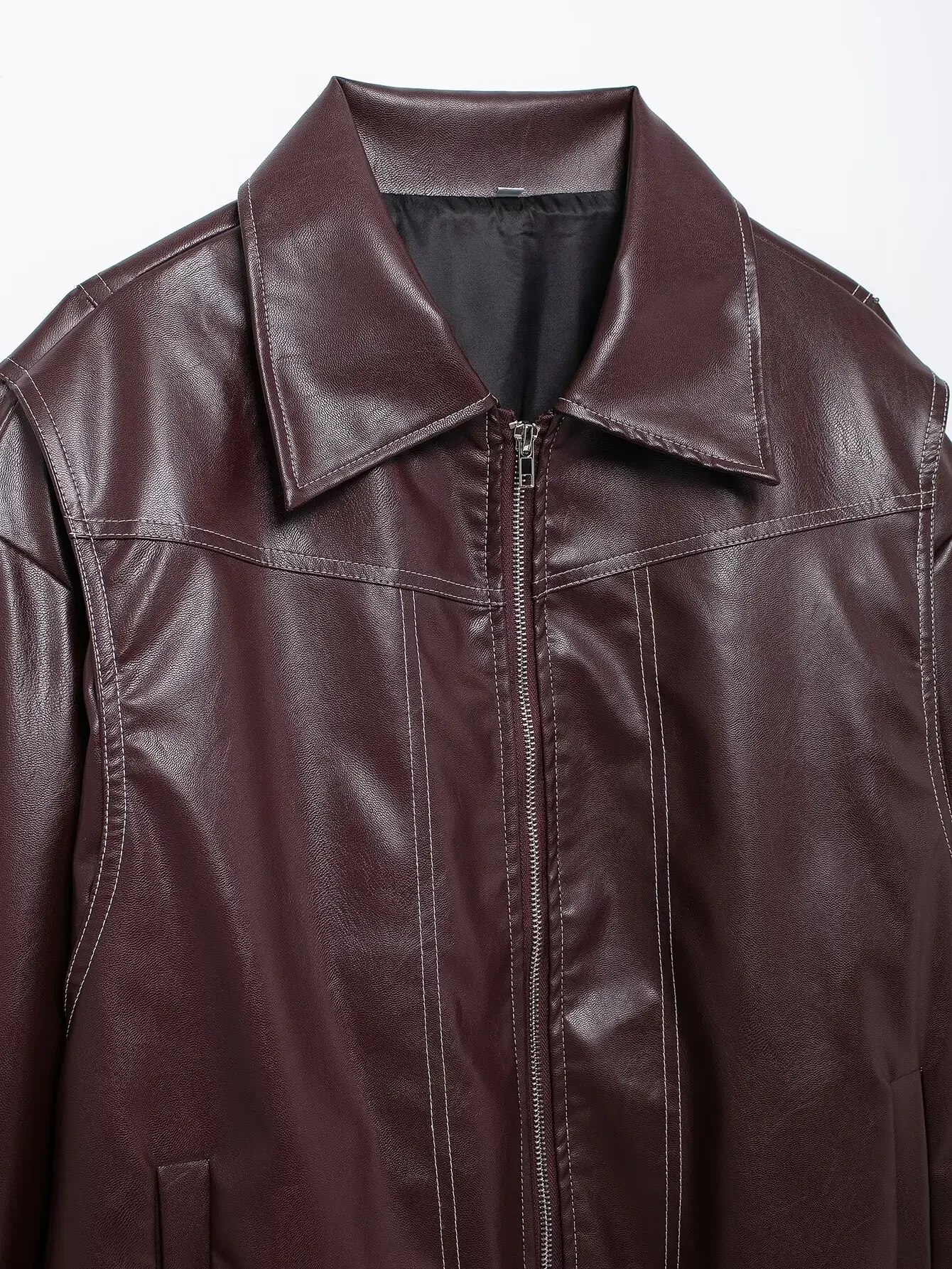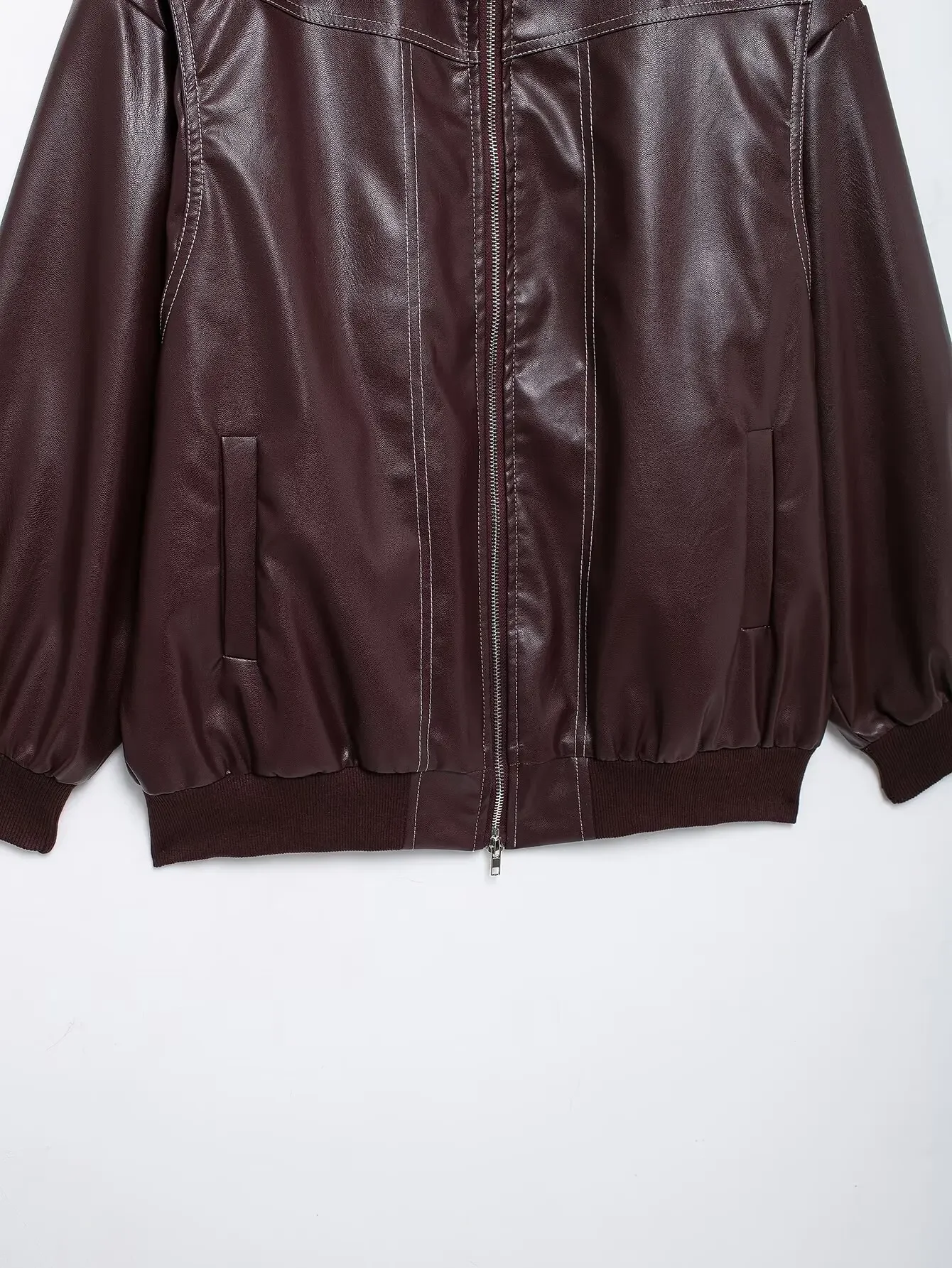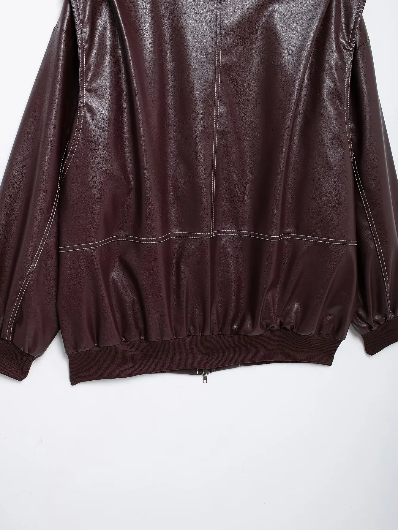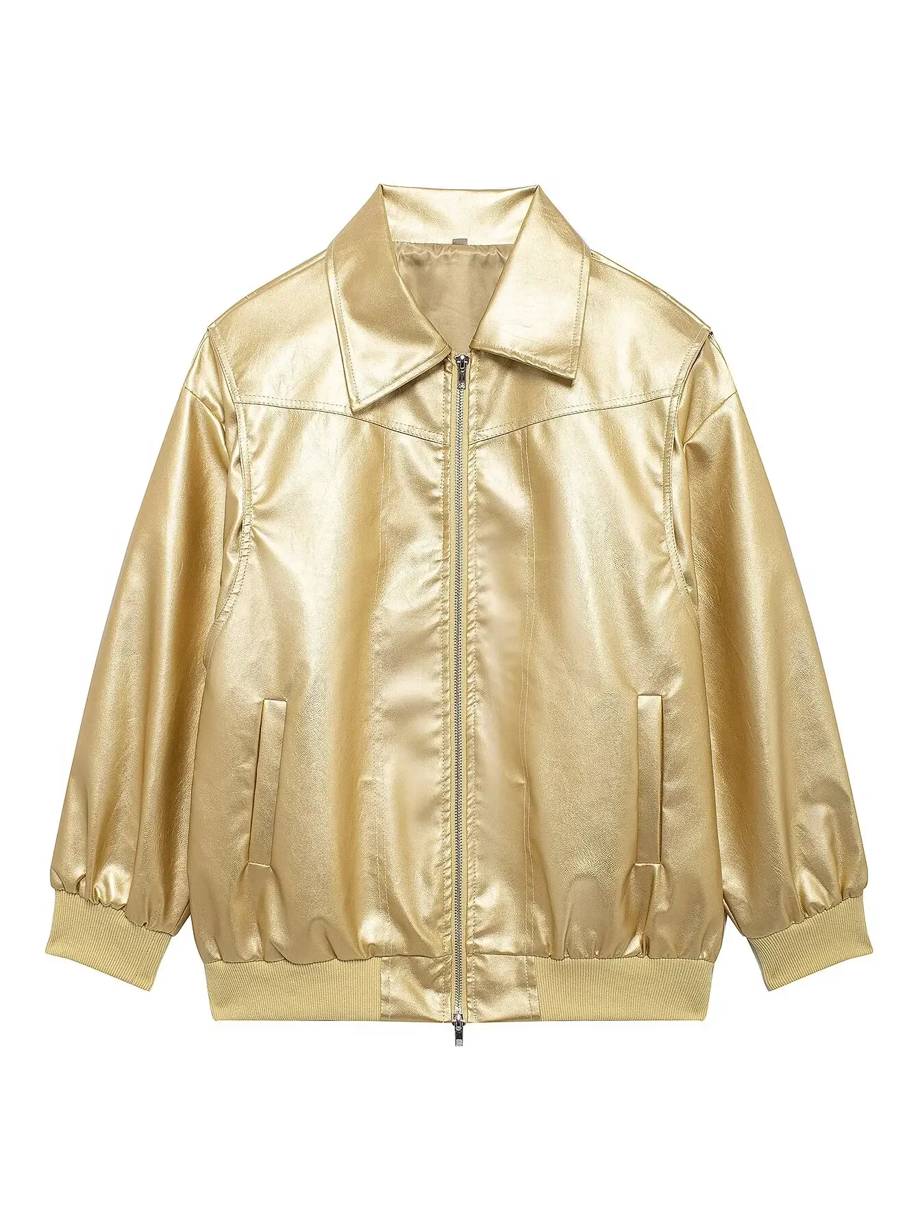 Women's new Fashion loose side pocket casual imitation leather jacket coat retro lapel long sleeved women's coat chic top