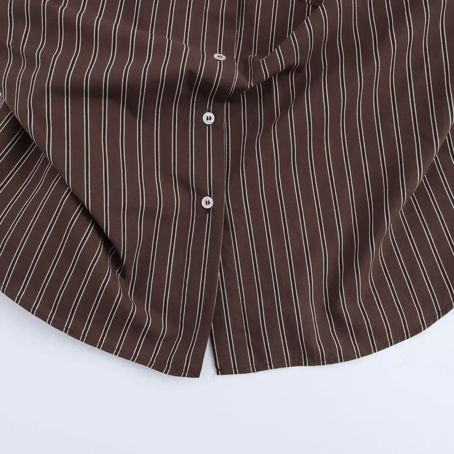 Women's new fashion pleated decoration loose single breasted casual striped shirt retro bat long sleeved women's shirt chic top