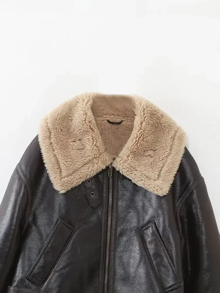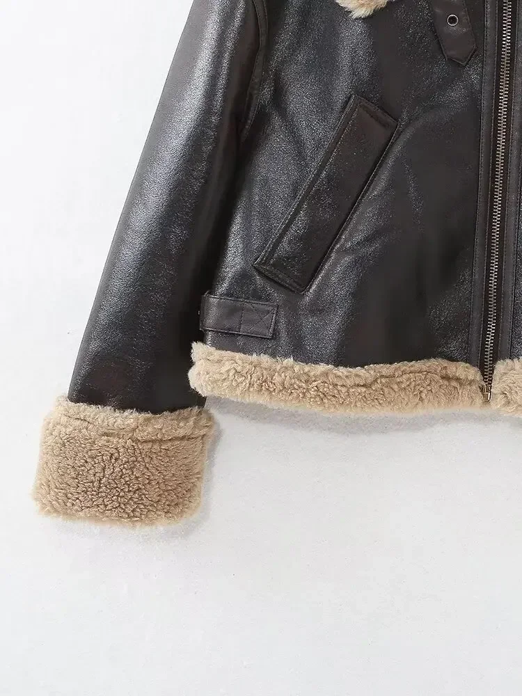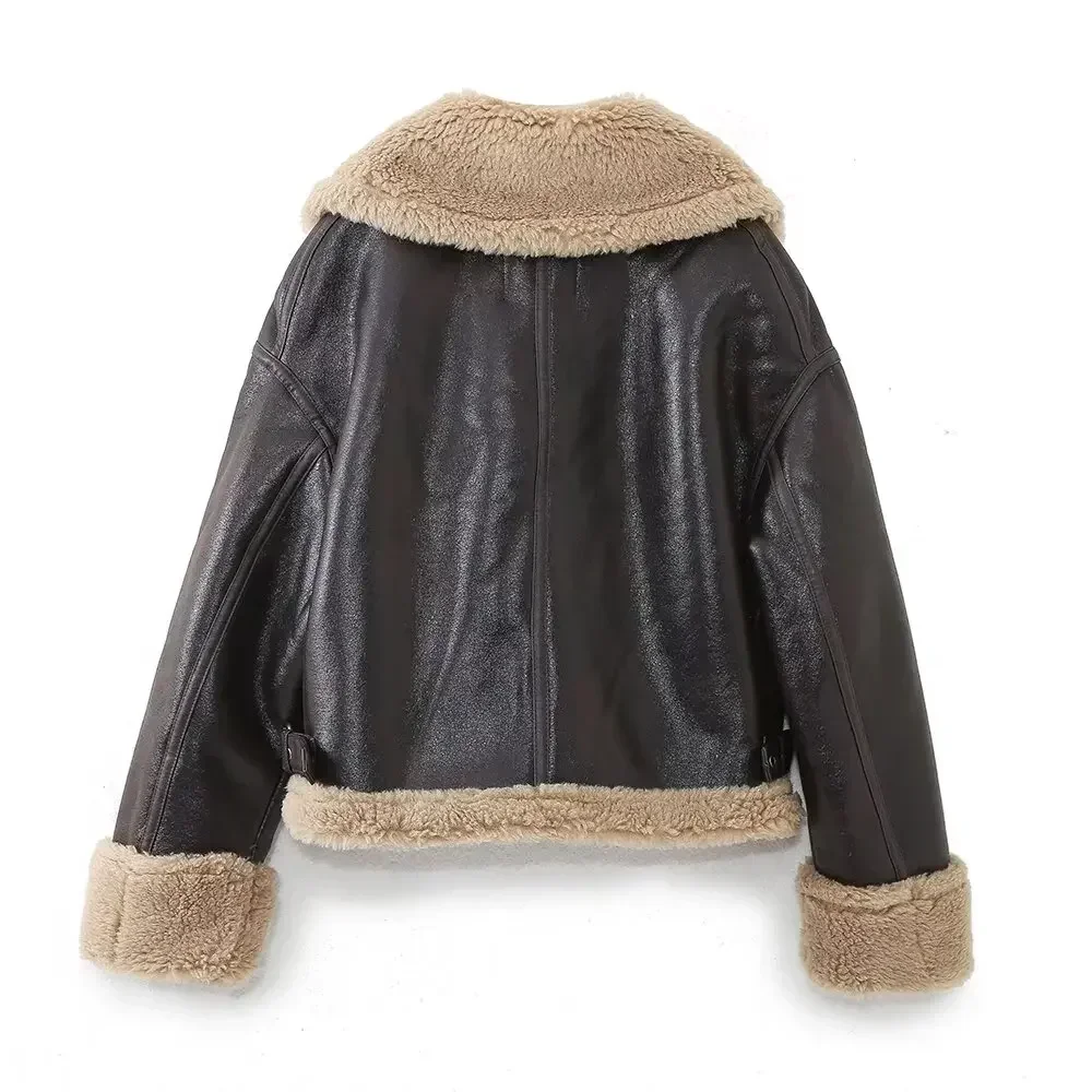 Women's new fashion short motorcycle style double-sided Fur Faux Leather jacket retro long sleeved Zipper women's Coat Chic top
