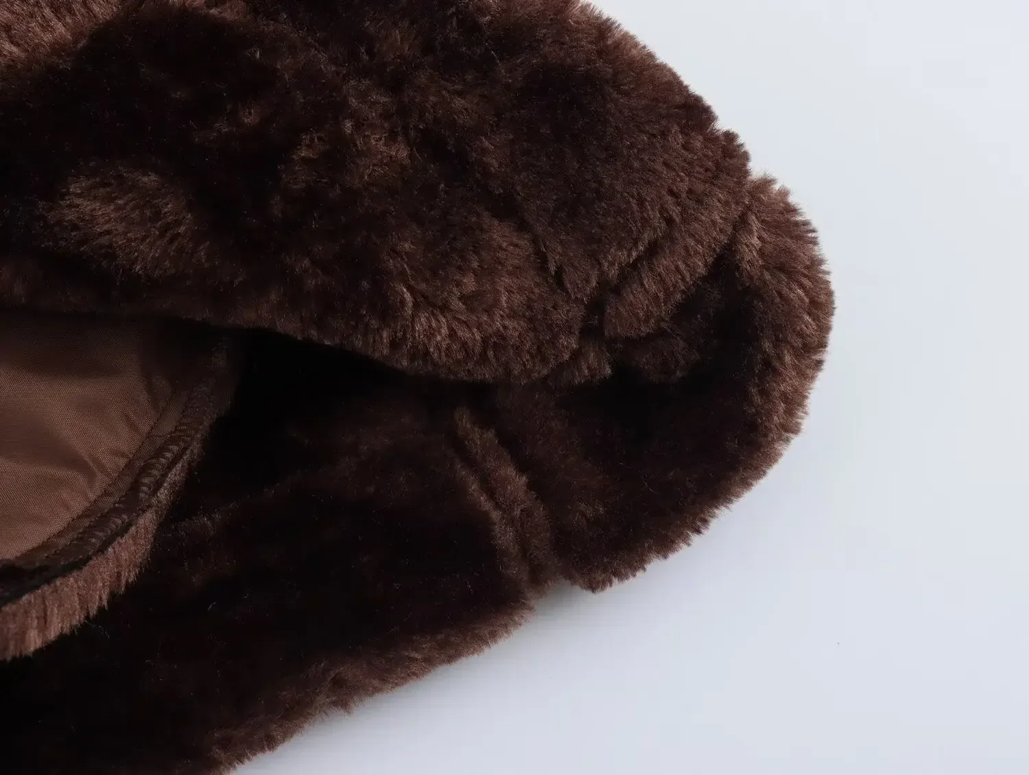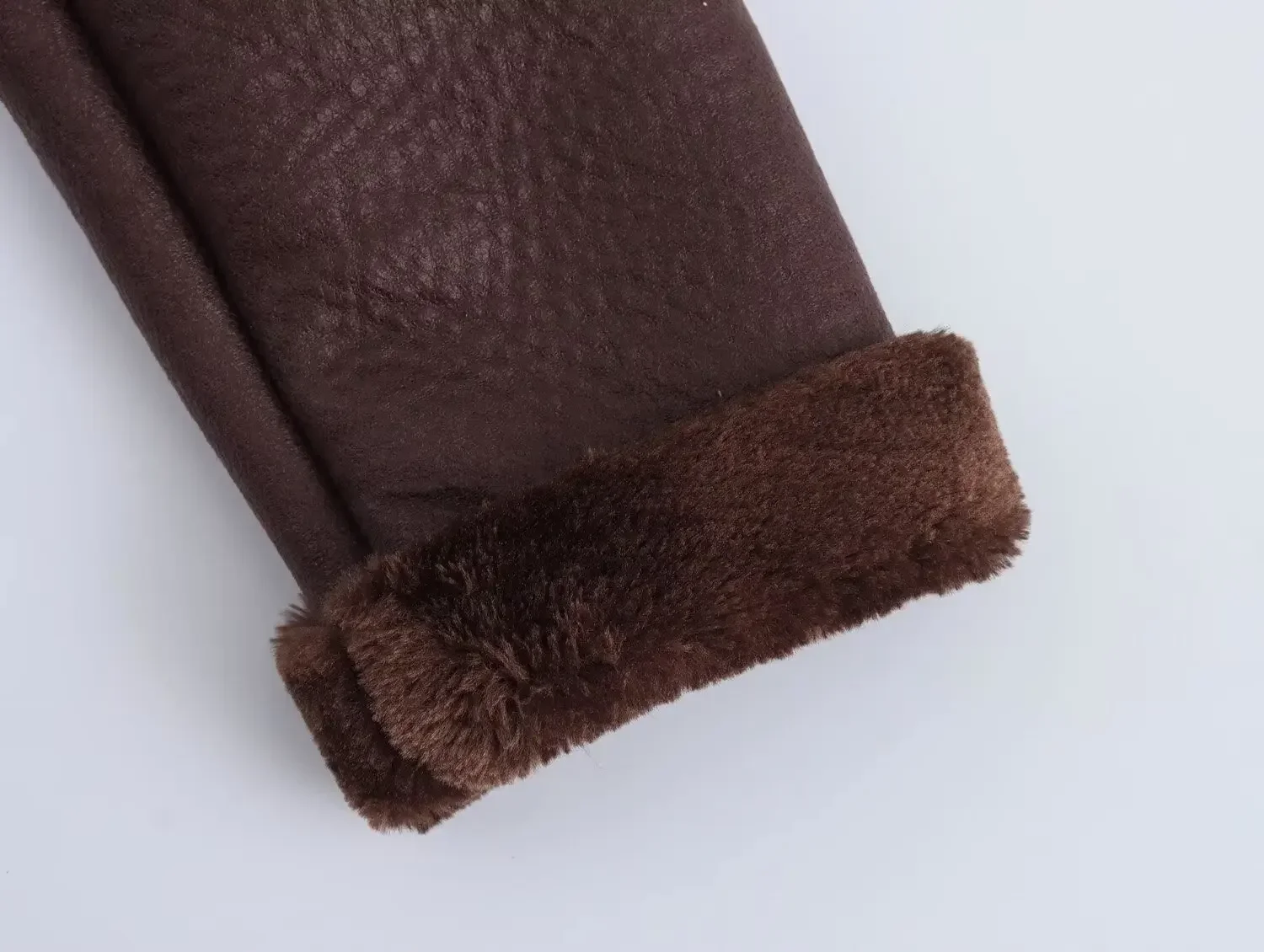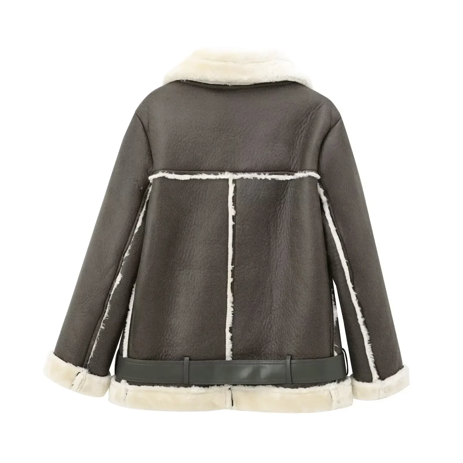 Women's new Fashion With Belt casual thick warm Fur Faux Leather jacket retro long sleeved zipper pocket women's Coat chic top