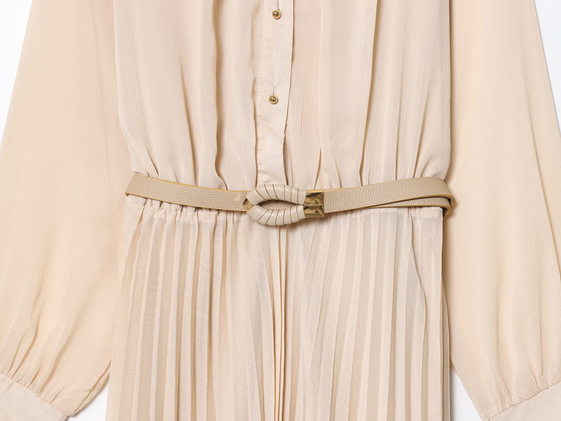 Women's New Fashion With Belt Long Sleeve Pleated Midi Dress