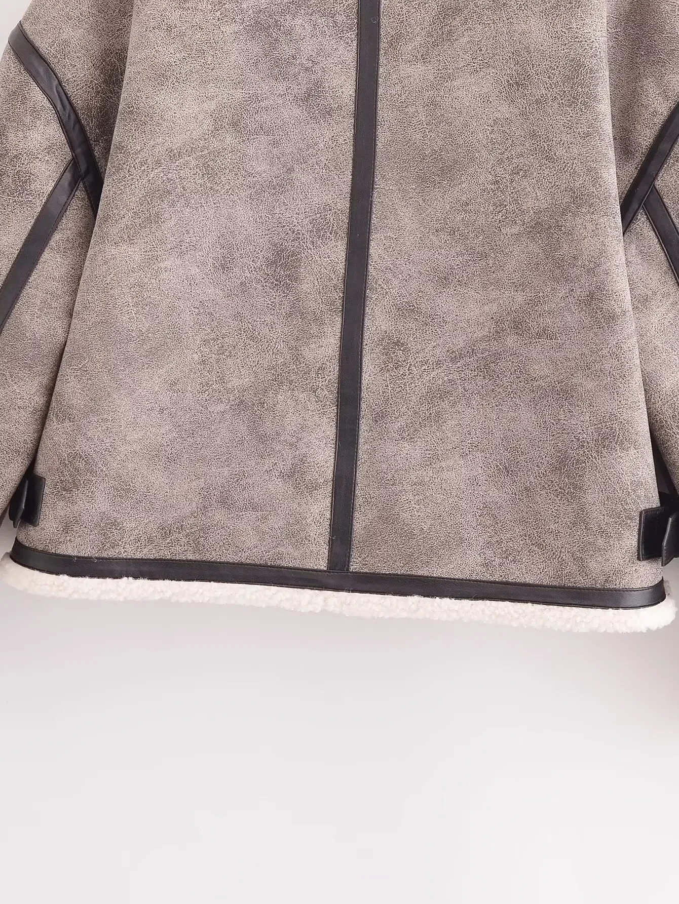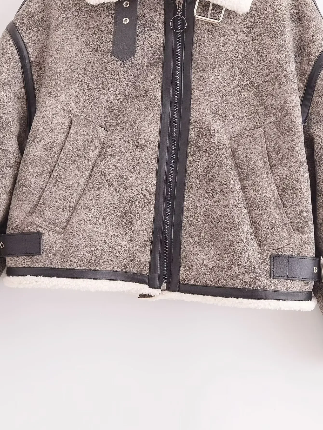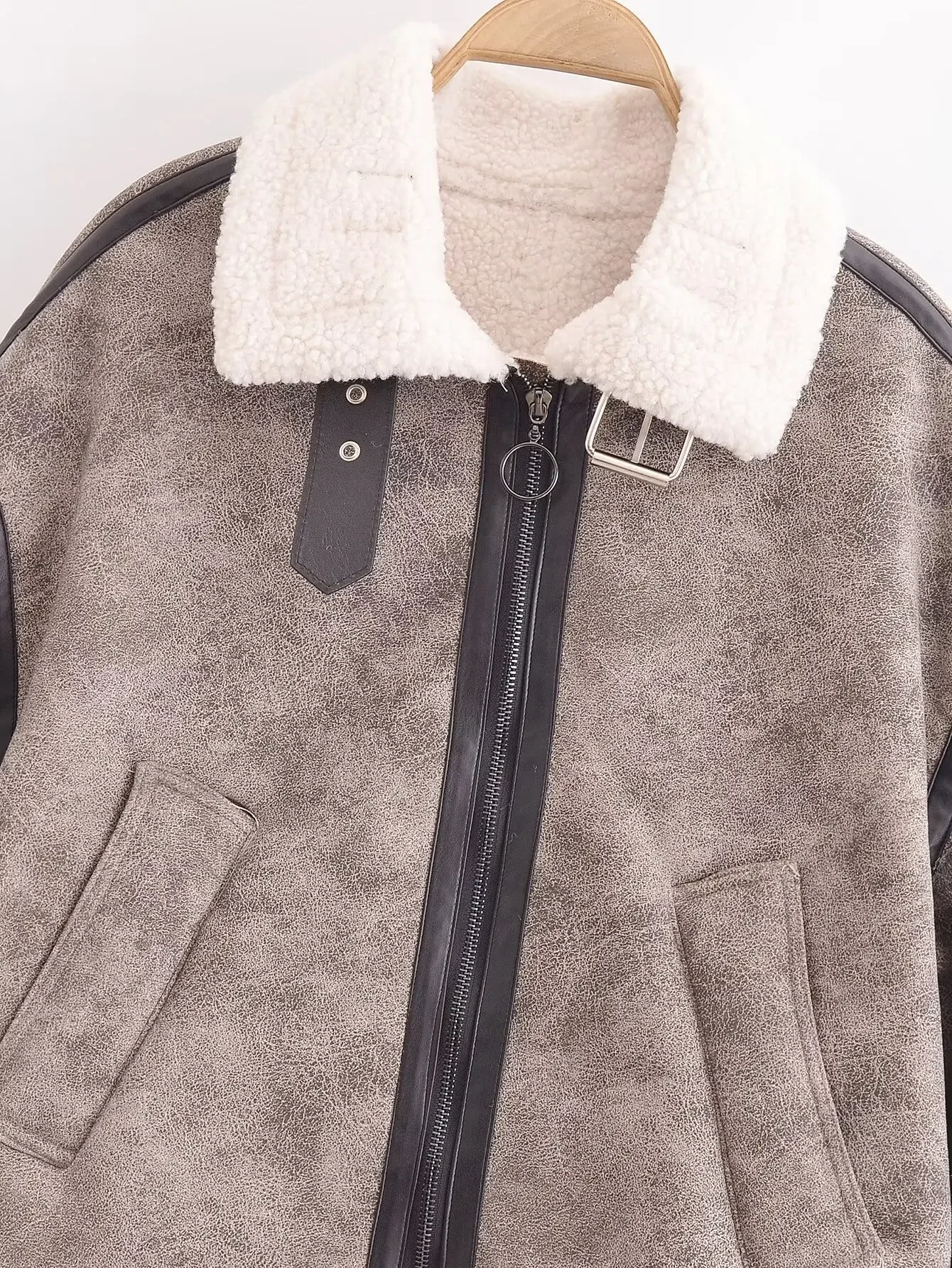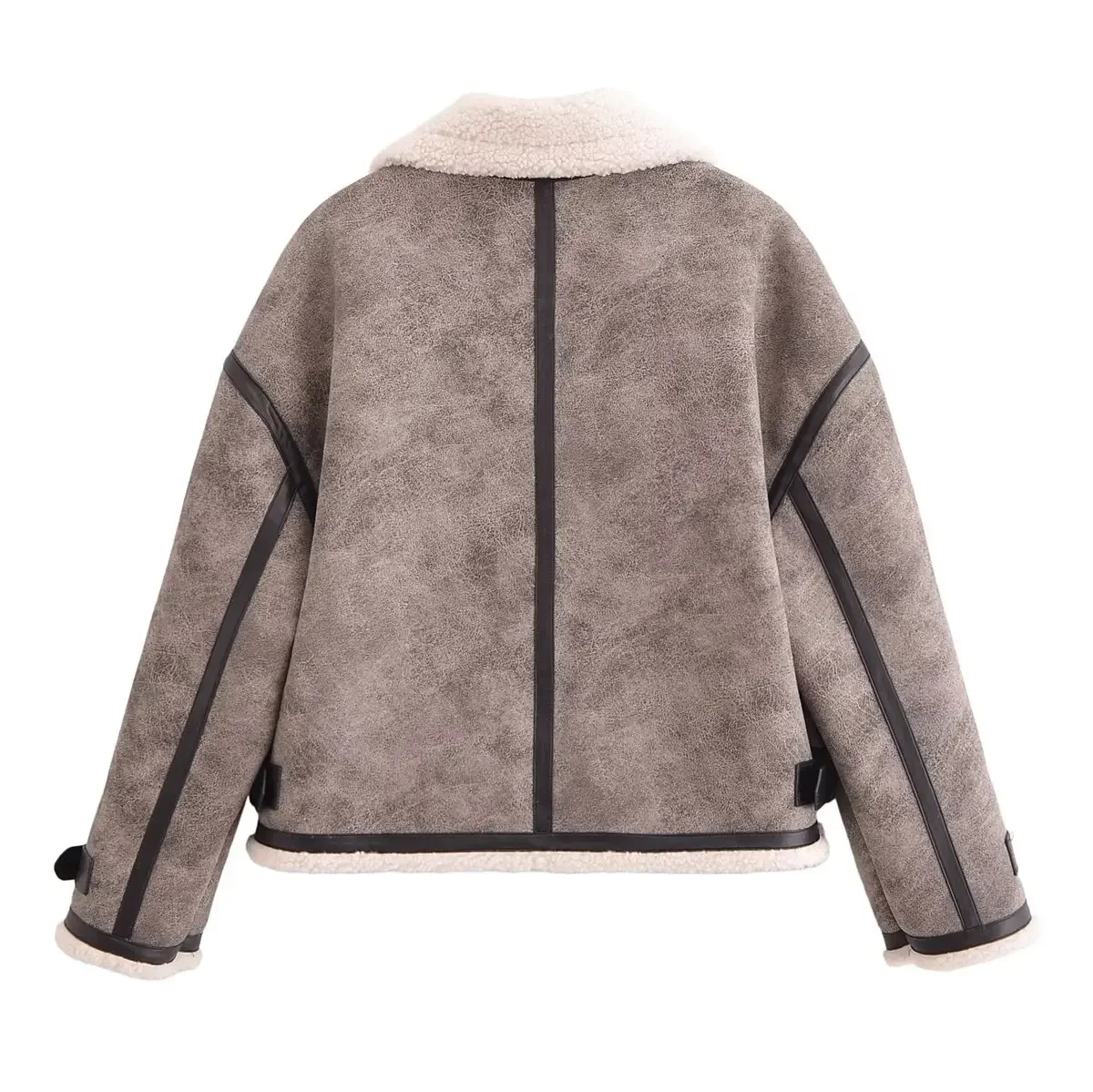 Women's Winter Fashion Casual Side Pocket Short Warm Fur Faux Leather Jacket Coat Retro Long Sleeve Zipper Women's Coat Chic Top